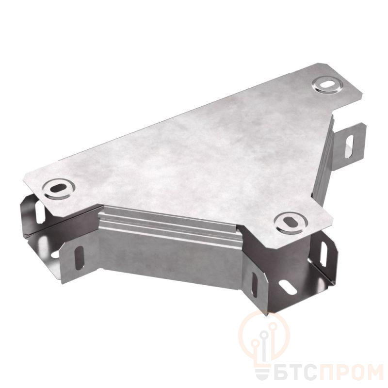 Аксессуары изготовленные из стали с защитным покрытием по методу Сендзимира – это изделия, на которых защитное цинковое покрытие было нанесено на листовую сталь перед изготовлением. Толщина защитного покрытия варьируется от 10 до 22мкм. Климатическое исполнение изделий УХЛ2, что предусматривают эксплуатацию в помещении и под навесом, при температуре эксплуатации от -80 до +150°С. Т-образный ответвитель предназначен для разветвления кабельных трасс в горизонтальном направлении,для перфорированных и глухих лотков. В комплект входит крышка.