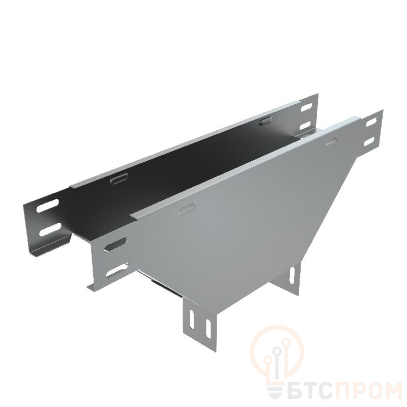 Т-ответвитель переходник вертикальный c разворотом трассы на 90 градусов БАЗОВОЙ СЕРИИ, в конструкции которого нижняя часть больше исходной, используется для отвода трассы вниз, при этом разворачивая открытую часть лотка вокруг своей оси под прямым углом. Применяется для организации плавных поворотов и позволяет осуществить переход трассы с исходной ширины лотка 150 мм на ширину 200 мм. Изделие выполнено из стали оцинкованной по методу Сендзимира. Предназначено для применения в местах предпочтительно с сухим климатом, внутри помещений и в слабоагрессивных средах, в соответствии с ГОСТ 15150-69. Элемент предупреждает повреждение кабеля при прокладке и позволяет рационально использовать внутренний объем.