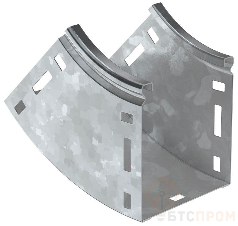 Поворот на 45° вертикальный внутренний плавный предназначен для организации вертикального внутреннего поворота кабельной трассы на 45°. Крышка аксессуара в комплект не входит. Аксессуар изготовлен из стали с цинковым покрытием, нанесенным погружением изделий в расплав цинка (защитный слой цинка не менее 55 мкм).