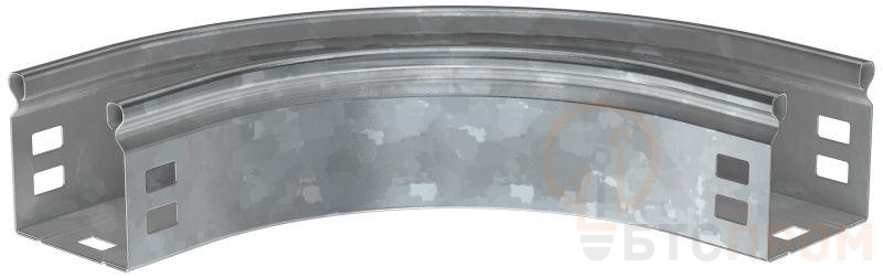 Поворот на 90° плавный предназначен для организации горизонтального поворота кабельной трассы на 90°. Крышка аксессуара в комплект не входит. Аксессуар изготовлен из стали с цинковым покрытием, нанесенным погружением изделий в расплав цинка (защитный слой цинка не менее 55 мкм).