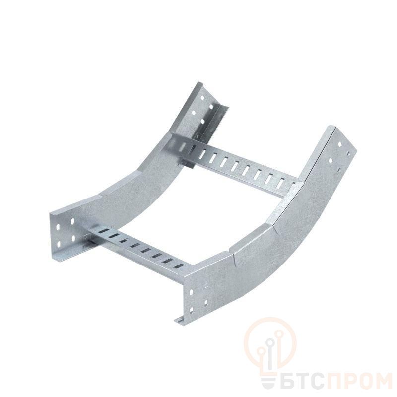 Угол вертикальный внутренний предназначен для организации поворота трассы на основе лестничных лотков с высотой борта 50 мм и шириной основания 400 мм вверх на 45 градусов. Радиус поворота угла - 600 мм. Аксессуар поставляется в комплекте с крепежными элементами и соединительными пластинами, необходимыми для монтажа. Данное изделие представлено в исполнении "Сталь, оцинкованная по методу Сендзимира". Толщина лонжерона изделия – 1,5 мм, а толщина поперечины – 1,0 мм.