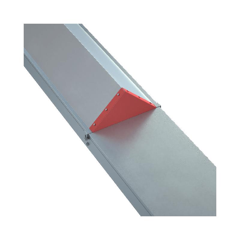 Заглушка двускатной крышки используется для завершения кабельной трассы. Устанавливается в торец крышки с целью повышения степени непроницаемости металлической конструкции. Изделие оцинковано методом горячего погружения согласно ГОСТ 9.307-89 и используется для монтажа в помещениях с высокой влажностью и низкой загрязненностью, под открытым небом и в слабокоррозийной среде, в соответствии с ГОСТ 15150-69. Заглушка устанавливается поверх двускатной крышки, и фиксируется с помощью кровельных саморезов. Элемент представляет собой цельное изделие, готовое к использованию и не требующее предварительной сборки, что значительно упрощает процесс монтажа.