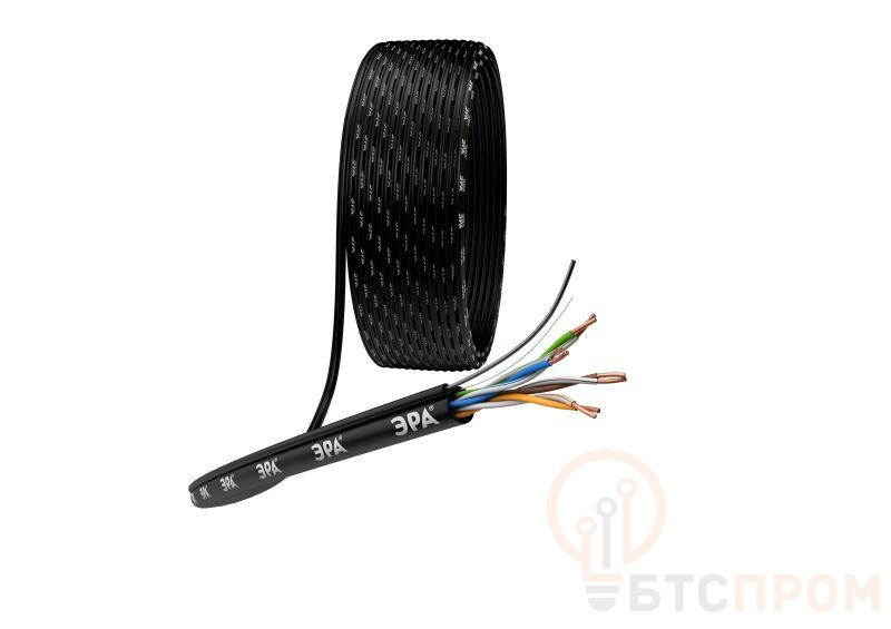 Кабель U/UTP 4x2x24 AWG Cat5e CU PE+ТРОС 305м ЭРА применяется для построения компьютерных и информационных сетей, систем охраны, телефонии, центров обработки данных, цифрового телевидения и видеонаблюдения (в том числе сPoE+), внутри и вне помещений, устойчив к ультрафиолетовым лучам . Самонесущий стальной трос, диаметр троса 1,13 мм