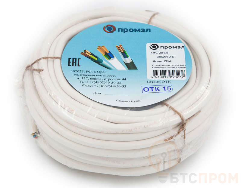 Провод ПВС 2х1.5 380В Б (бухта 20м) (шт) ПромЭл 13321500 фото в каталоге от BTSprom.by