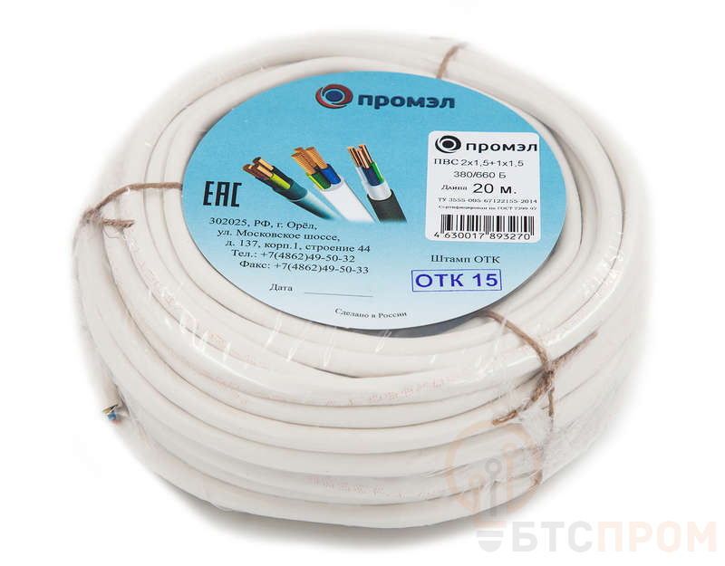 Провод ПВС 3х1.5 (2х1.5+1х1.5) 380В Б (бухта 20м) (шт) ПромЭл 13321620 фото в каталоге от BTSprom.by