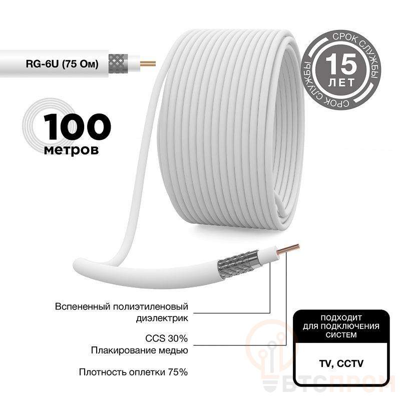 Коаксиальный кабель RG-6U PROconnect Light служит для передачи высокочастотных сигналов, для подключения спутниковых и кабельных телевизионных систем, камер видеонаблюдения и устройств, поддерживающих HDTV. Применяется при подключении внутренних и межблочных соединений различных радиотехнических устройств. Предназначен для прокладки внутри помещений. Центральный проводник изготовлен из стали плакированной медью, окружен диэлектриком из вспененного полиэтилена. Поверх диэлектрика наложен экран из алюминиевой фольги, на котором располагается внешний проводник из алюминиевой проволоки в виде оплетки плотностью 32%. Внешняя оболочка выполнена из ПВХ. Цвет – белый. Изделие отличается долгим сроком службы,поставляется в бухте длиной 100 м. Диаметр проволоки экрана: 0,12-0,15 мм.