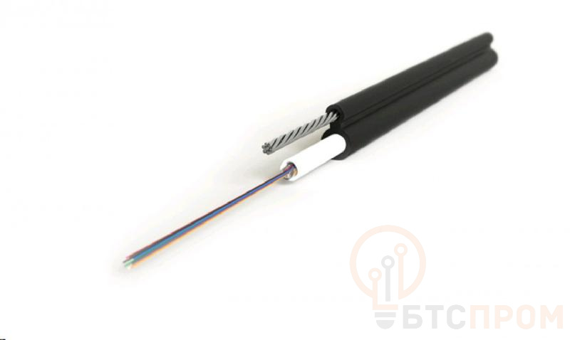 Кабель имеет одномодульную конструкцию со свободно уложенными волокнами в одном центральном модуле, заполненном гидрофобным гелем для защиты от влаги. Усилительный элемент — стальной трос диаметром 2.2 мм — обеспечивает высокую стойкость к механическим нагрузкам и растяжению. Внешняя оболочка из полиэтилена (PE) черного цвета обладает устойчивостью к ультрафиолетовому излучению, перепадам температур и агрессивным средам.