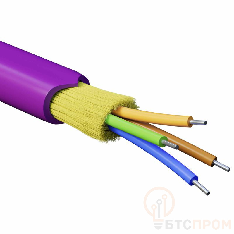 Кабель волоконно-оптический, распределительный, применяется для обеспечения связи между кроссовыми полями и внутри здания. Под внешней оболочкой размещены арамидные упрочняющие нити, повышающие устойчивость к растягивающим нагрузкам не утяжеляя кабель. Оболочка безгалогенная, соответствует классу нг(А)-HFLTx, что позволяет применять кабель в помещениях с высокими требованиями пожарной безопасности, включая больницы, дома престарелых, школы и места массового пребывания людей. Кабель содержит 4 многомодовых оптических волокон в плотном буфере 900мкм, категория OM4 (G.651.1). Поставляется на фанерной катушке.