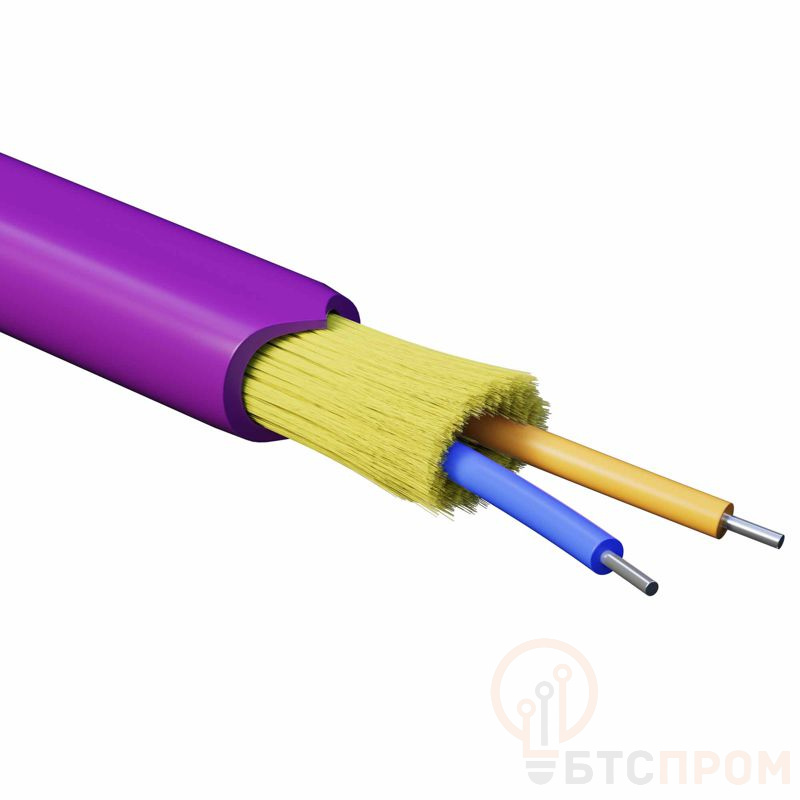 Кабель волоконно-оптический, распределительный, применяется для обеспечения связи между кроссовыми полями и внутри здания. Под внешней оболочкой размещены арамидные упрочняющие нити, повышающие устойчивость к растягивающим нагрузкам не утяжеляя кабель. Оболочка безгалогенная, соответствует классу нг(А)-HFLTx, что позволяет применять кабель в помещениях с высокими требованиями пожарной безопасности, включая больницы, дома престарелых, школы и места массового пребывания людей. Кабель содержит 2 многомодовых оптических волокон в плотном буфере 900мкм, категория OM4 (G.651.1). Поставляется на фанерной катушке.