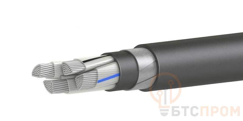 кабель силовой с 4 алюминиевыми многопроволочными жилами секторой формы сечением 120 миллиметров квадратных, с изоляцией из сшитого полиэтилена и защитным шлангом из полиэтилена в броне из двух стальных оцинкованных лент на напряжение 1 кВ.