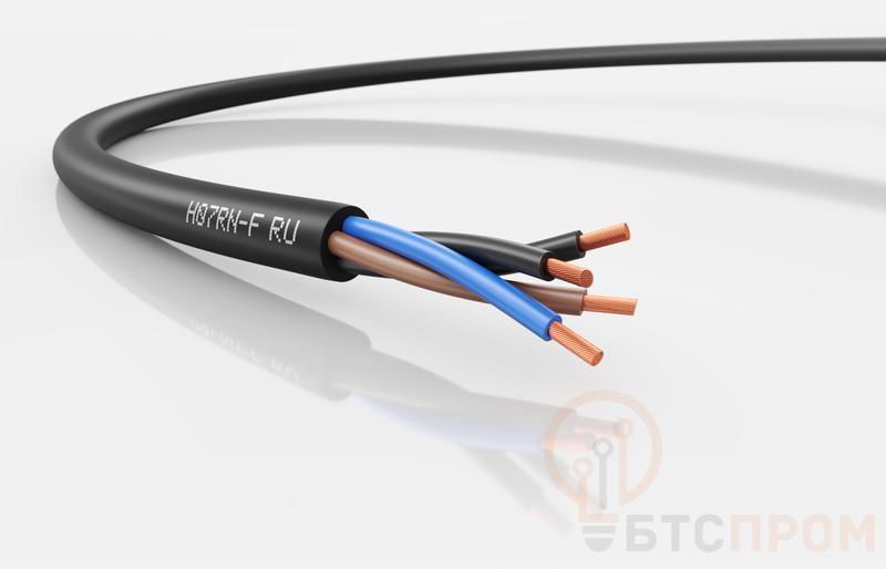H07RN–F RU – гибкий кабель силовой и управления с резиновой изоляцией и резиновой оболочкой российского производства, на основе международного стандарт 50525-2-21 с улучшенными характеристиками. Для подключения передвижных машин, механизмов и оборудования к электрическим сетям на номинальное напряжение 450/750 В переменного тока номинальной частотой до 400 Гц или постоянное номинальное напряжение 1000 В. Кабель предназначен для эксплуатации в условиях воздействия на оболочку дезинфицирующих и агрессивных веществ, а также смазочных масел. Непрерывное долговременное погружение в воду на глубину до 100 м (только стоячая вода, температура не менее +5°С, не питьевая).