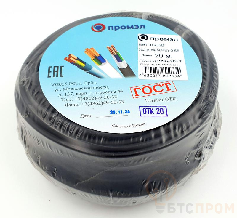 Кабель ВВГ-Пнг(А) 3х2.5 (N PE) 0.66кВ (уп.20м) ПромЭл 13321820 фото в каталоге от BTSprom.by