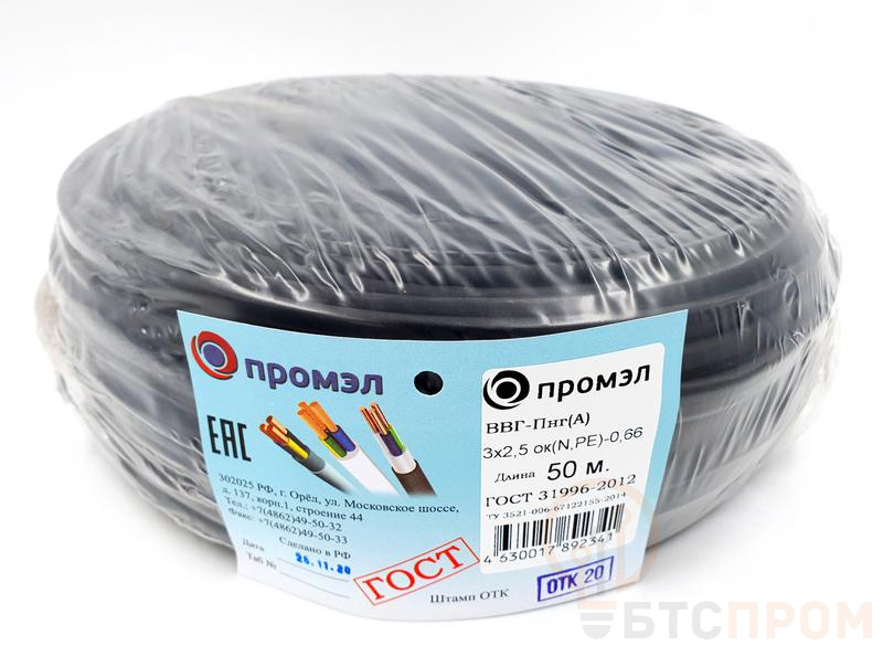 Кабель силовой с тремя однопроволочными медными жилами номинальным сечением 2,5 мм2 с изоляцией из поливинилхлоридного пластиката в оболочке из поливинилхлоридного пластиката, не распространяющий горение, на напряжение 0,66 кВ