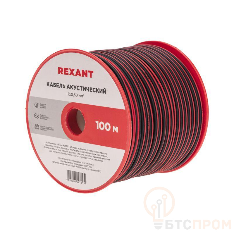 Акустический кабель ШВПМ REXANT размером 2х0,50 мм2 применяется для подключения звуковых систем и выступает в качестве важного элемента для передачи аудиосигнала. Является залогом отличного звука домашней или автомобильной аудиоаппаратуры. Конструктивно кабель состоит из двух многожильных проводников, расположенных параллельно друг другу. Проводники находятся в изоляции из ПВХ красного и черного цвета, которая защищает от внешних помех и механических повреждений. Изделие обладает разделительным основанием, что позволяет разъединять проводники без повреждения изоляции и оголения жил.