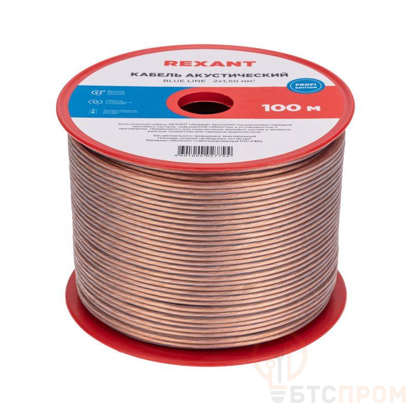 Акустический кабель REXANT серии BLUELINE предназначен для подключения полупрофессионального акустического оборудования. Отличается долгим сроком службы и качеством изготавливаемых материалов. Кабель состоит из двух многожильных проводников, плакированных медью не менее 50% и расположенных параллельно друг другу. Проводники защищены изоляцией из прозрачного ПВХ, на которую нанесена синяя полоса. Основание кабелей – разделительное, благодаря чему при разделении проводников не требуется снимать изоляцию и оголять жилы. Площадь сечения жил – 1,50 мм2.