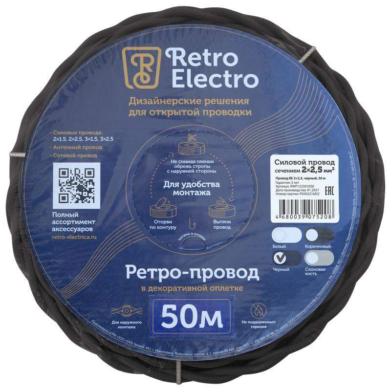 Провод ретро 2х2.5 черный от бренда RetroElectro (артикул 2254755) – это надежный двужильный кабель в декоративной оплетке, предназначенный для открытой электропроводки. Каждая жила имеет сечение 2.5 мм², что позволяет подключать мощные светильники, розетки и другую бытовую технику. Провод поставляется в удобной упаковке по 50 метров.