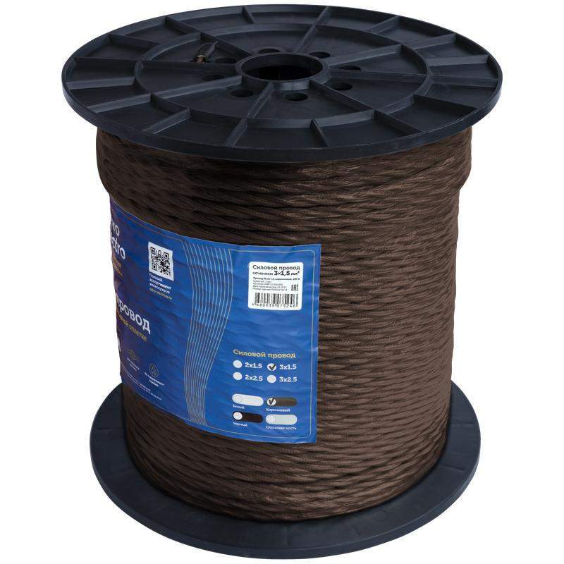 Кабель состоит из трех многопроволочных медных жил сечением 1.5 мм² каждая, что обеспечивает надежное подключение осветительных приборов и розеточных групп. Двойная изоляция из высококачественного ПВХ и внешняя оплетка из искусственного шелка декоративного коричневого цвета не только обеспечивают безопасность и долговечность, но и служат стильным элементом дизайна.