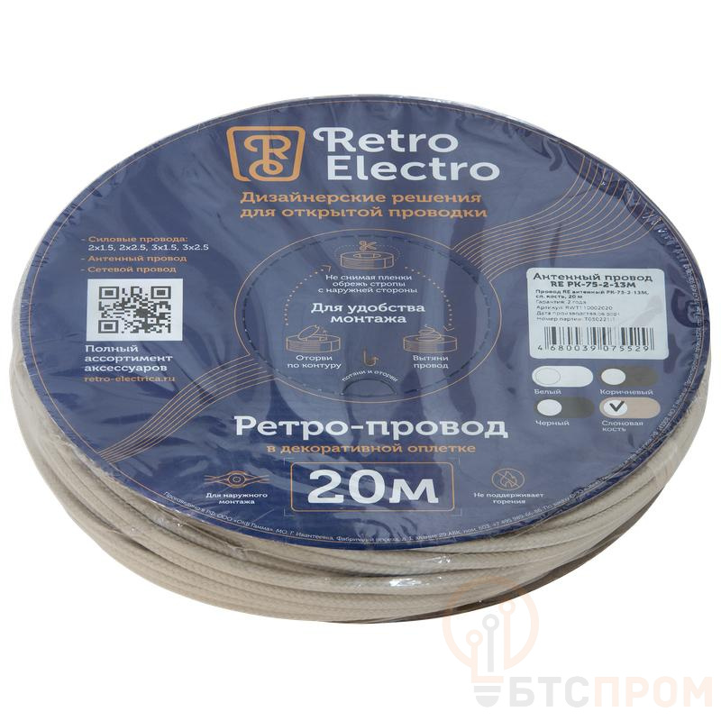Ретро антенный провод TV "Слоновая кость" от бренда RetroElectro – это современное кабельное решение, выполненное в стильном винтажном дизайне. Данный провод предназначен для передачи телевизионного сигнала (эфирного и спутникового) и станет отличным выбором для создания аутентичного интерьера или маскировки кабеля на светлых поверхностях.