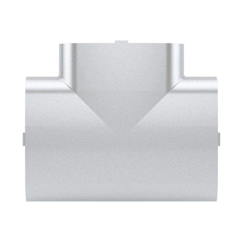 Тройник (Т-образный отвод) 140х50. Назначение: эстетичное оформление мест Т-образного соединения кабельных коробов. Характеристики: материал накладки – АБС-пластик, устойчив к воздействию УФ-излучения; материал базы и разделителей – ПП. Комплект поставки: внешняя декоративная накладка; внутренняя база с разделителем; инструкция по монтажу. Размер 140х50. Цвет: серебристый металлик RAL 9006