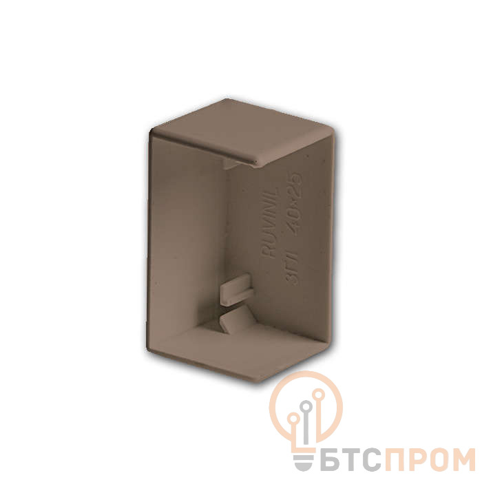Заглушка для кабель-канала РКК 40х40 коричневая от бренда Ruvinil (модель ЗГЛ-40х40-К) — это завершающий аксессуар, предназначенный для установки на торцы пластикового короба соответствующего размера 40x40 мм. Изделие обеспечивает эстетичный и безопасный вид электромонтажа, надежно фиксируясь на канале и предотвращая попадание пыли, влаги и посторонних предметов внутрь.