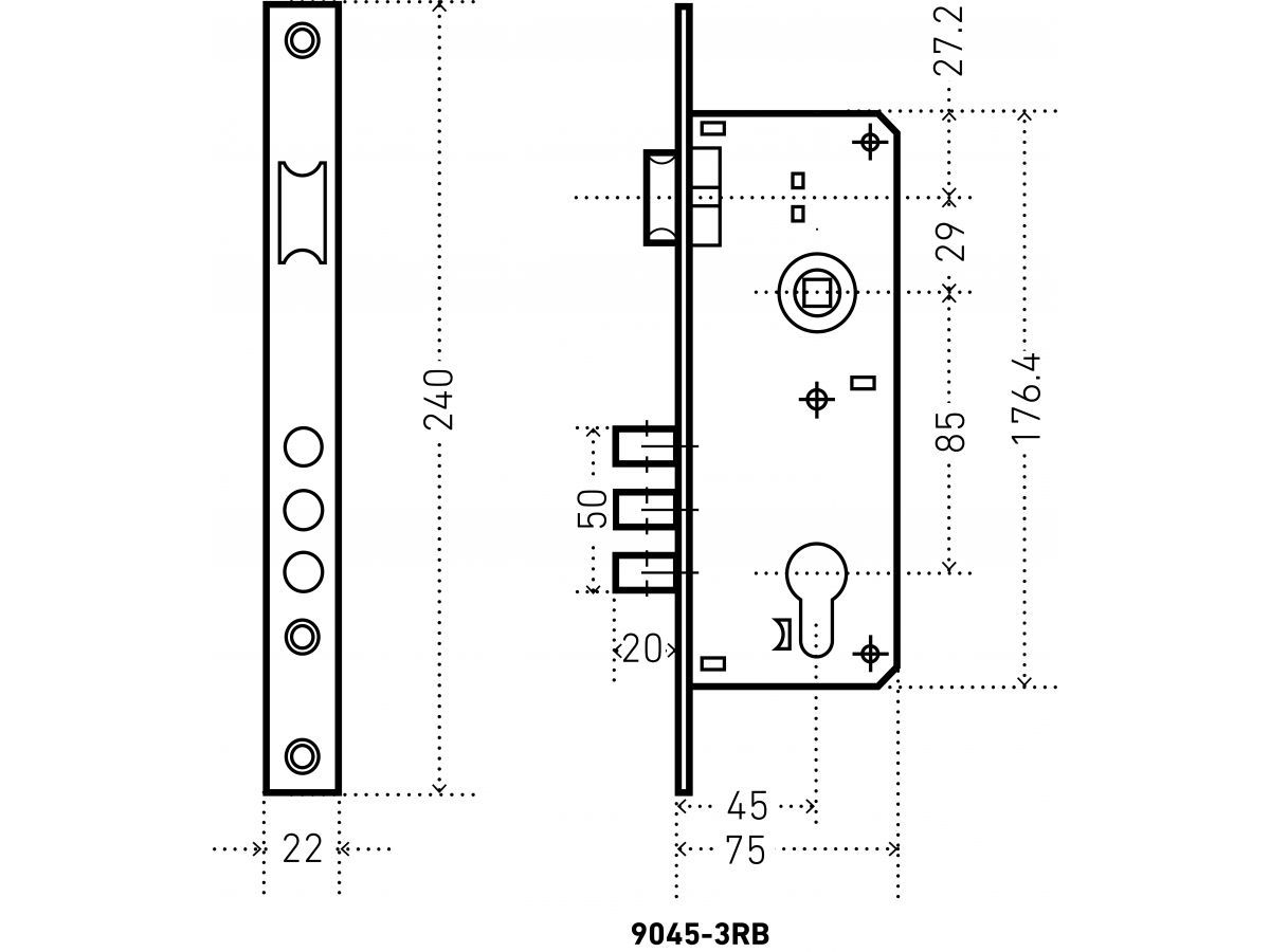 Вылет ригелей 20мм. Удаление ключевого отверстия 45мм.