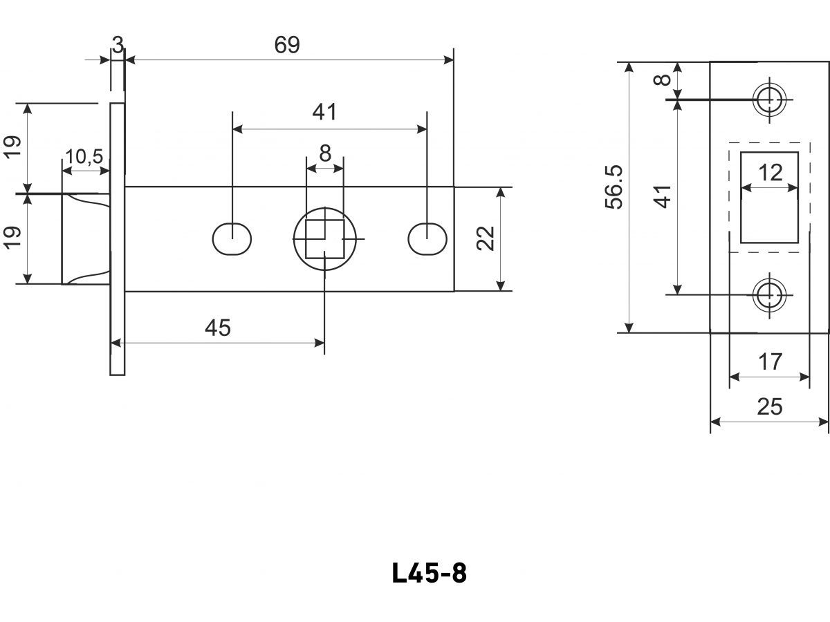 Универсальная защёлка врезная для установки на деревянные межкомнатные двери. Материал - сталь оцинкованная штампованная, гальваническое покрытие. Под ручку с квадратом 8 мм. Удаление ключевого отверстия - 45 мм. Торцевая планка с защитной пленкой для сохранения покрытия. Ширина планки - 25мм. Габариты корпуса - 72.5х22х15 мм. В комплекте - защелка, ответная планка и белый пластиковый вкладыш к ней, саморезы.