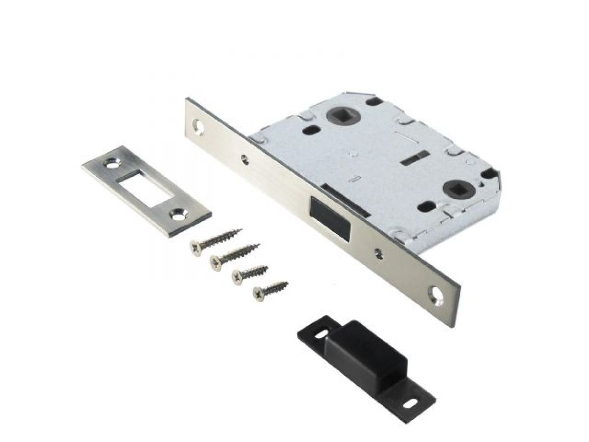 Универсальная защёлка врезная для установки на деревянные межкомнатные двери. Материал - сталь, гальваническое покрытие.Под ручку с квадратом 8 мм и сантехническую завертку с квадратом 6 мм. Удаление ключевого отверстия - 47 мм. Межосевое расстояние - 70 мм. Прямоугольная торцевая планка. Ширина планки - 18мм. Габариты корпуса - 96х71х12 мм. В комплекте - защелка, саморезы, ответная планка и белый пластиковый вкладыш к ней.