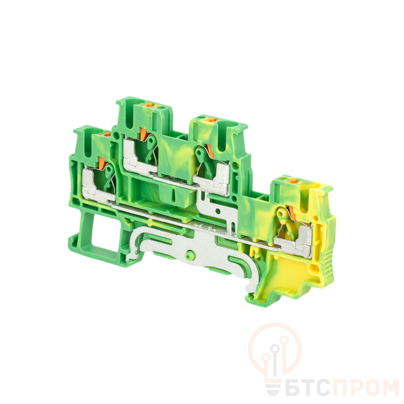 Клемма MTP-D2.5PE от компании ОВЕН — это двухуровневая push-in клемма для заземления, предназначенная для быстрого и надежного монтажа в электрощитовом оборудовании. Основное сечение подключаемого проводника составляет 2.5 кв.мм. Модель имеет специальную маркировку «Земля» и соответствующую желто-зеленую расцветку для идентификации.
