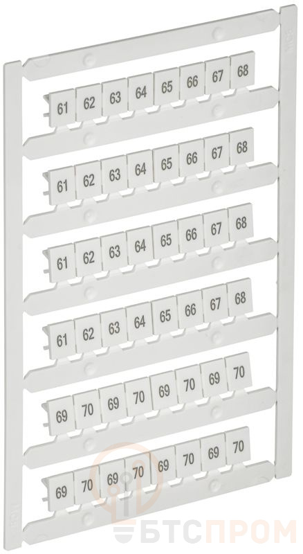 Изделие имеет стандартный размер 61-70, что позволяет надежно маркировать трассы диаметром до 10 кв.мм (CP) или пучки кабелей сечением до 6 кв.мм (CTS). Маркер изготовлен из прочного, устойчивого к ультрафиолету и воздействию окружающей среды пластика (материал PA66), обеспечивающего сохранность надписей в течение длительного срока службы. На поверхности предусмотрено специальное матовое поле для нанесения обозначений перманентным маркером или принтером.