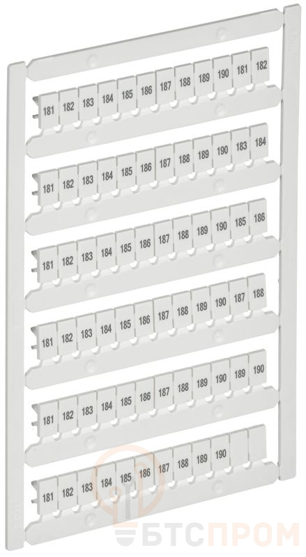 Изделие предназначено для использования на кабельных трассах и перфолентах серии CTS/CP от IEK, рассчитанных на кабели сечением 4 мм². Маркер имеет стандартный размер и надежно фиксируется на конструкции. На лицевой поверхности нанесена четкая и стойкая маркировка с числовым индексом от 181 до 190, что обеспечивает долговечность обозначения в условиях эксплуатации.