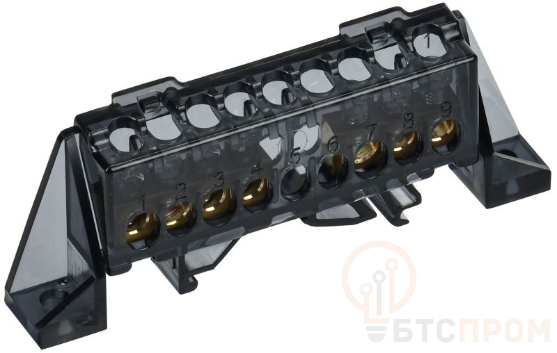 Конструкция шины включает 9 отверстий для подключения проводников сечением до 10 мм²: 3 отверстия под болт М6 для входящих цепей и 4 отверстия под болт М5 для отходящих цепей, а также 2 отверстия для крепления самой шины на DIN-рейку. Изделие изготовлено из высококачественного сплава, обладающего отличной электропроводностью и коррозионной стойкостью.