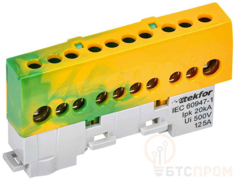 Шина PE "земля" изолированная на универсальном держателе 8х12-10-ЖЗ TEKFOR IEK (артикул: TF-NN20-10-KL-K52) — это высококачественное электроустановочное изделие, предназначенное для надежного и безопасного соединения заземляющих (нулевых защитных) проводников в распределительных щитах и шкафах.