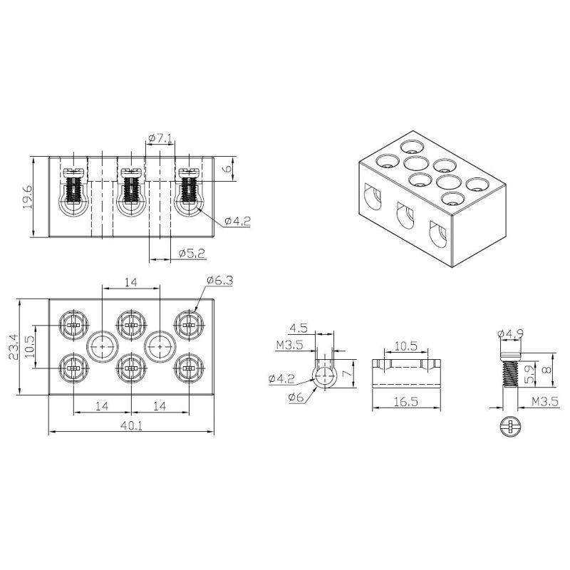 Термостойкие клеммные колодки REXANT предназначены для соединения проводов, которые могут находиться под воздействием высоких температур. Изготовлены из качественного изоляционного материала, который обладает высокой стойкостью на пробой даже при воздействии влаги, устойчив к токам поверхностной утечки, не горит. 1. Сечение многожильного провода -10мм2 2. Номинальный ток - 10А 3.Номинальное рабочее напряжение - 400В 4.Тип соединения - винтовое 5. Количество клемм 3х2 6. Диапазон рабочих температур: от -40 до +450 0С.