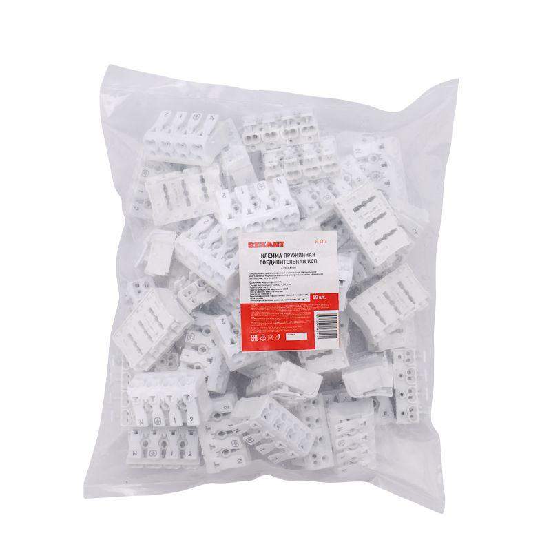 Пружинные четырехполюсные клеммы REXANT предназначены для присоединения и ответвления одножильных и многожильных медных проводников в электрических цепях переменного тока напряжением до 450 В. Наличие маркировки («фаза», «ноль», «земля») на подвижной части зажима. Материал корпуса – самозатухающий ПВХ, материал контакта – электротехническая сталь. 1. Сечение многожильного провода -0,5х2,5мм2 2. Номинальный ток - 16А 3.Номинальное рабочее напряжение - 450В 4.Тип соединения - фиксатор/защелка 5. Количество полюсов - 4. 6. Наличие маркировки («фаза», «ноль», «земля») на подвижной части зажима. 7. Температурный диапазон в режиме эксплуатации: -60... +40 ?