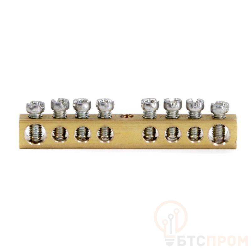 Шина применяется для коммутации кабелей, проводов, питающих жил. Расчитана на работу с токами до 63 А. Крепление шины по центру. Шина имеет 8 отверстий для коммутации. 2 отверстия сечением 6 мм2, 6 отверстий сечением 4 мм2.