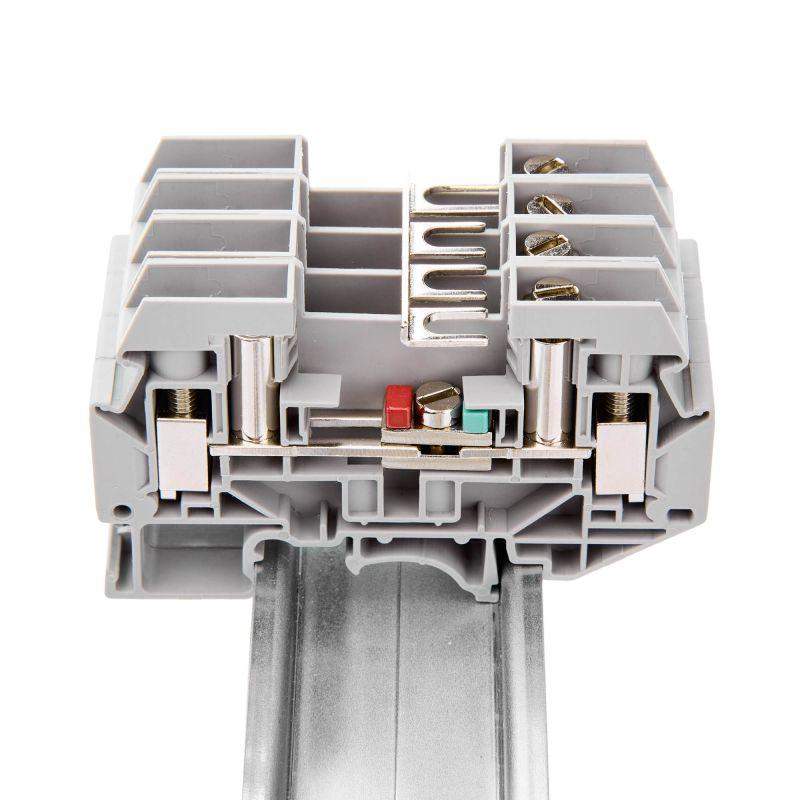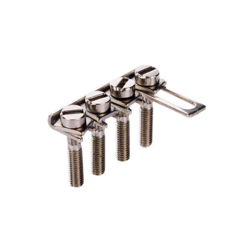 Перемычка сдвижная (слева) винтовая, четырехполюсная для быстрого и надежного перемыкания измерительных винтовых клемм TUR-6-RTK-S. Возможен пропуск при соединении клемм за счет выкручивания винтов.