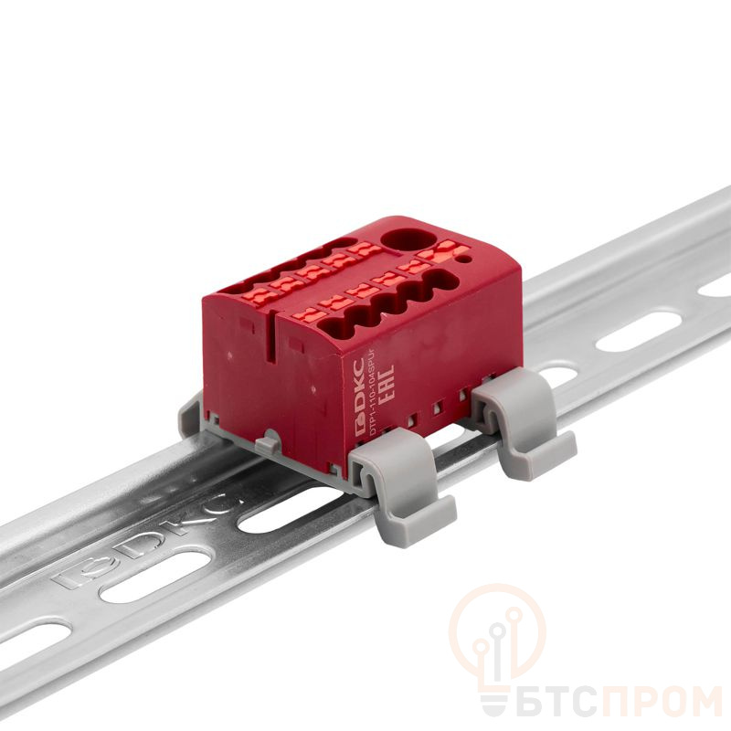 Блок распределительный с горизонт. адаптером на рейку шир. 35мм зажим push-in 1 ввод 6кв.мм 10 точек подключения 2.5кв.мм красн. DKC DTP1-110-104SPUR-H