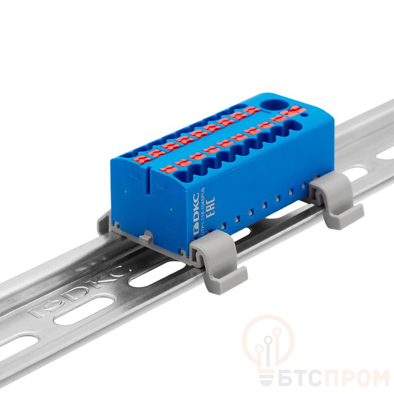 Блок распределительный с горизонт. адаптером на рейку шир. 35мм зажим push-in 1 ввод 6кв.мм 18 точек подключения 2.5кв.мм син. DKC DTP1-118-104SPUB-H