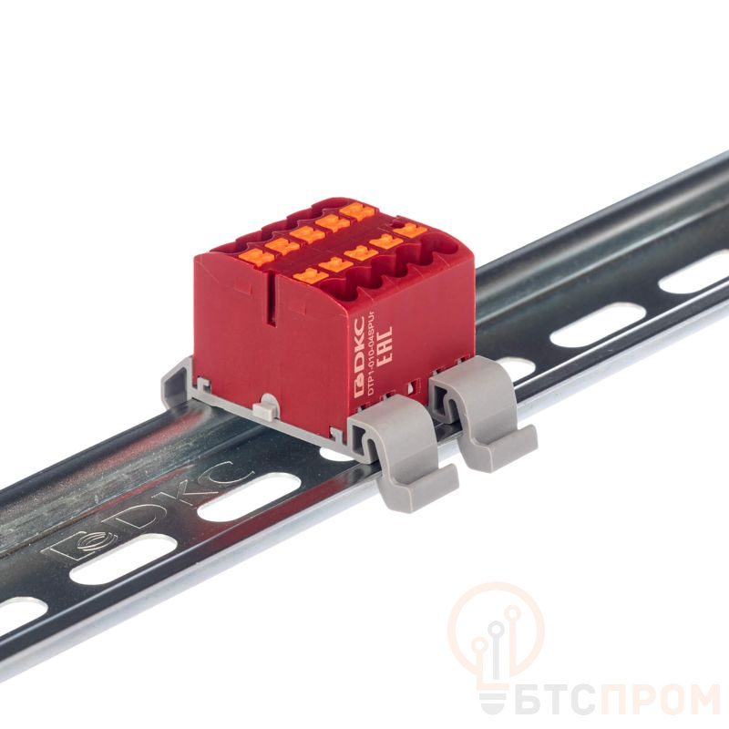 Блок распределительный с горизонт. адаптером на рейку шир. 35мм зажим push-in 10 точек подключения 2.5кв.мм красн. DKC DTP1-010-04SPUR-H