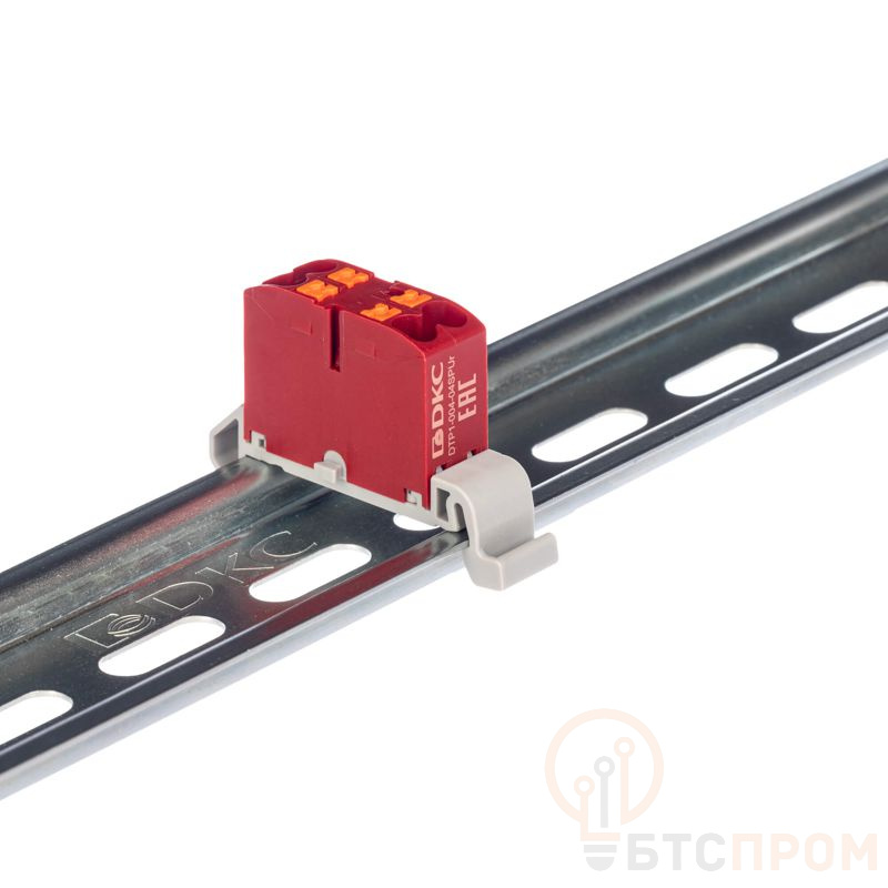Блок распределительный с горизонт. адаптером на рейку шир. 35мм зажим push-in 4 точки подключения 2.5кв.мм красн. DKC DTP1-004-04SPUR-H