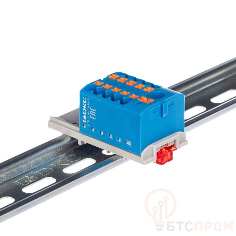 Блок распределительный с вертикал. адаптером на рейки шир. 15/35мм зажим push-in 1 ввод 6кв.мм 10 точек подключения 2.5кв.мм син. DKC DTP1-110-104SPUB-V