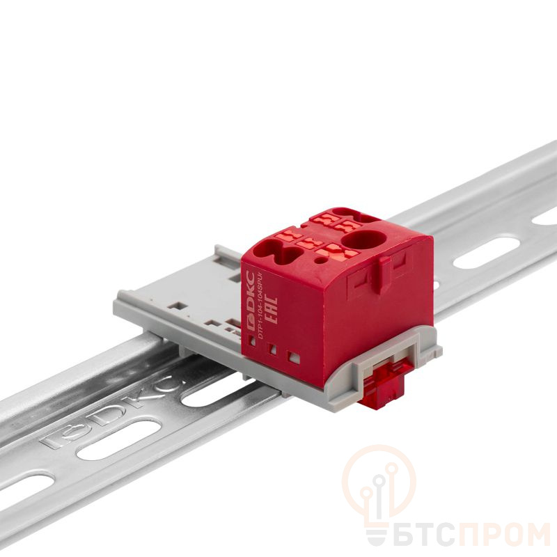 Блок распределительный с вертикал. адаптером на рейки шир. 15/35мм зажим push-in 1 ввод 6кв.мм 4 точки подключения 2.5кв.мм красн. DKC DTP1-104-104SPUR-V