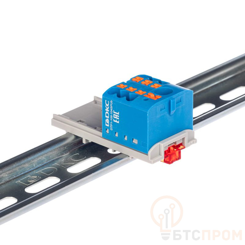 Блок распределительный с вертикал. адаптером на рейки шир. 15/35мм зажим push-in 1 ввод 6кв.мм 6 точек подключения 2.5кв.мм син. DKC DTP1-106-104SPUB-V