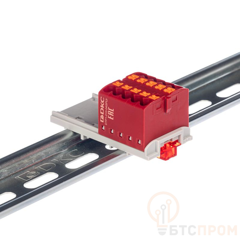 Блок распределительный с вертикал. адаптером на рейки шир. 15/35мм зажим push-in 10 точек подключения 2.5кв.мм красн. DKC DTP1-010-04SPUR-V