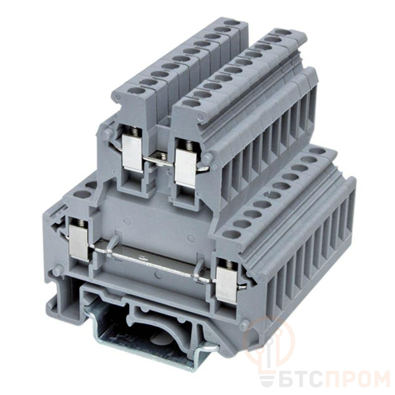 Клемма двухуровневая с винтовым зажимом предназначена для соединения четырех проводников. Монтаж на DIN-рейку OMEGA. Температура эксплуатации от -40 до +105°C. Корпус выполнен из ПА 6.6 с классом горючести V0 UL-94. Серый цвет, 4 точки подключения, 2.5 мм2. 1 канал винтовых перемычек. Габариты (В?Ш?Г) 62?56?5,2 мм.