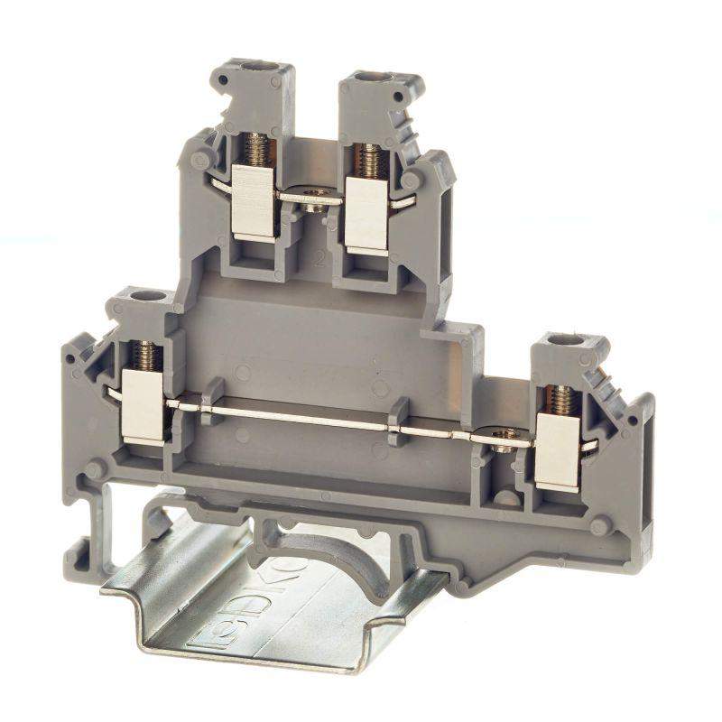 Клемма двухуровневая с винтовым зажимом предназначена для соединения четырех проводников. Монтаж на DIN-рейку OMEGA. Температура эксплуатации от -40 до +105°C. Корпус выполнен из ПА 6.6 с классом горючести V0 UL-94. Серый цвет, 4 точки подключения, 2.5 мм2. 1 канал винтовых перемычек на каждом уровне. Габариты (В?Ш?Г) 62?56?5,2 мм.