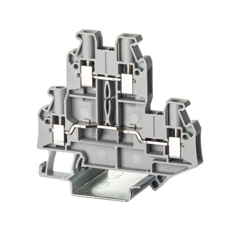 Клемма двухуровневая с винтовым зажимом предназначена для соединения четырех проводников. Монтаж на DIN-рейку OMEGA. Температура эксплуатации от -40 до +105°C. Корпус выполнен из ПА 6.6 с классом горючести V0 UL-94. Серый цвет, 4 точки подключения, 4 мм2. 2 канала для вставных перемычек на каждом уровне. Габариты (В?Ш?Г) 66?73,5?6,2 мм.