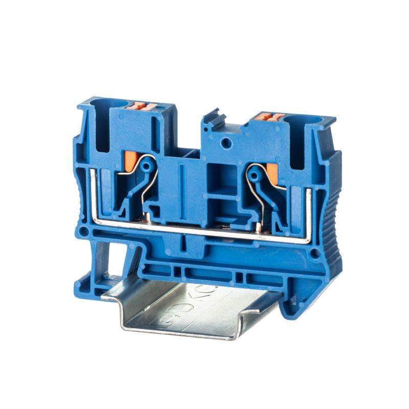 Проходная клемма с зажимом Push-in предназначена для соединения двух проводников, а за счет кнопки-толкателя обеспечивается защита от ошибок при монтаже и случайного прикосновения. Монтаж осуществляется на DIN-рейку OMEGA. Температура эксплуатации от -40 до +105оС. Корпус выполнен из ПА 6.6 с классом горючести V0 UL-94. Синий цвет, 2 точки подключения, 6 мм2. 2 канала для вставных перемычек. Габариты (В?Ш?Г) 47,5?47,7?8,2 мм.