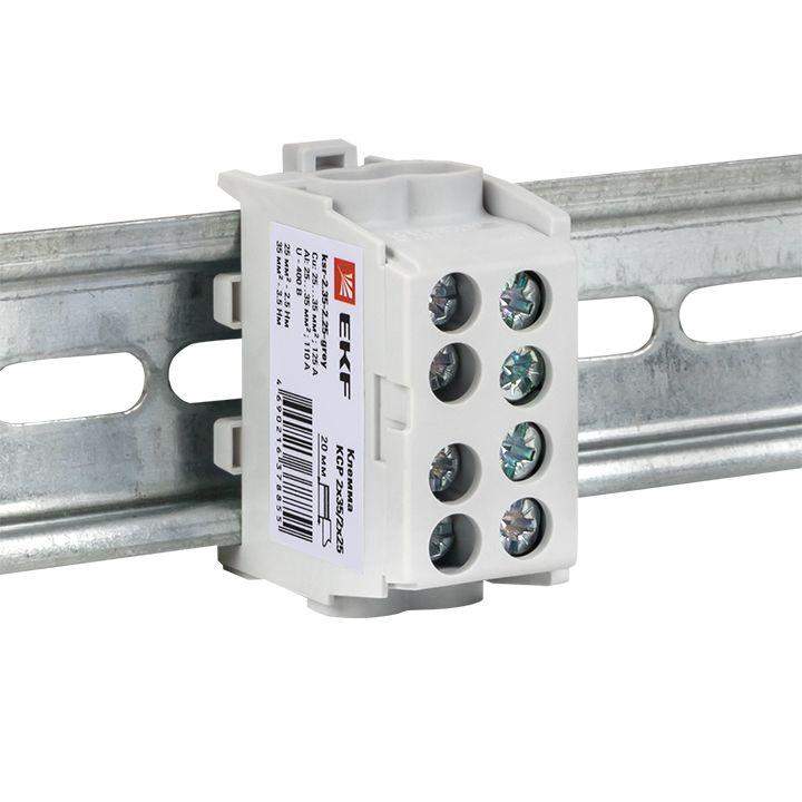 EKF серии PROxima предназначены для подключения и разветвления фазных, нулевых проводников и проводников заземления с сечением до 35 мм2. Благодаря данным клеммам можно закрепить проводник двумя винтами, что позволяет увеличить площадь контакта и обеспечить повышенную фиксацию. Две пары отверстий разного диаметра позволяют произвести переход на другое сечение.