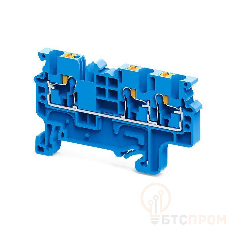 Клемма проходная типа push-in с тремя выводами на номинальное сечение проводника 2,5 кв. мм. Предназначена для установки в распределительных шкафах и щитах систем автоматического управления (САУ) с монтажом на DIN-рейки. Клеммы позволяют легко присоединить круглые медные проводники, номинальным сечением 2,5 кв.мм, обеспечивая надежный контакт и простоту сборки электрических схем. Особенностью данного типа клемм является возможность подключения трёх проводников в одной клемме, обеспечивая большую плотность подключений и компактность решения. Все клеммные зажимы в одной клемме имеют электрическую связь. Клеммы применяются в электрических цепях на номинальное напряжение до 1000 В переменного тока.